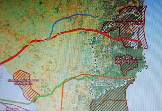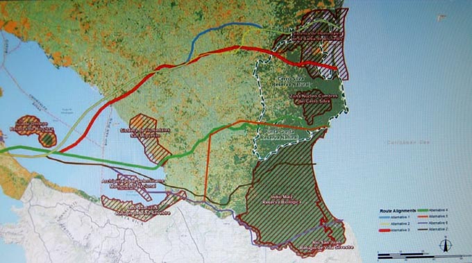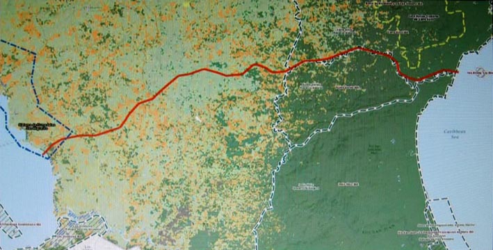 * 提案されているルート(赤線表示)は、セロ・シルバ自然保護区(Reserva Natural de Cerro Silva)、メソアメリカの生物