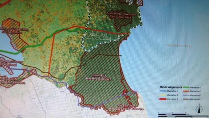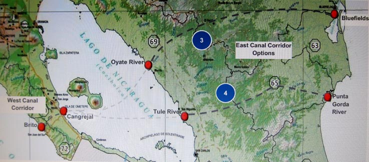 従前からの候補ルート: ニカラグア地峡の東部地域(ニカラグア湖のカリブ海寄り)におけるルート。
