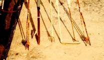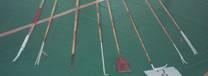 (1) 左上に鎌が見られる。3m以上の柄がついており、ワカメ等を刈取るために用いられる。 (2) 3m以上の柄の先には鉄製の部分があり、少し開いて3本に分かれる。先に捲いてあるゴムの位置を、 水中で発見したサザエやウニの大きさに合わせて調節する。これで上から押させると、先は開き、 緩めると閉まって発見された生物は漁獲される。 (3) 四角の長いカシ棒でできた柄の先に、細長い2枚の鉄板が付いた漁具である。左に見られる楔(クサビ) を2枚の鉄板の間に挟んで広げる。この鉄板はしなやかで、発見したアワビの近くの海底に上から押しつけると、 先は海底の岩に沿って水平になる。それをアワビの下にさし込む。楔をはずすと、アワビは挟まれて漁獲される。 (4) 先は3本に分かれ、上からナマコ等を突き刺す。 (5) 鎌でワカメ等を刈取る。 (6) 海藻を刈取ったり、小動物を海底からはがすのに使われる。 (7) (2)と同じであるが、沈め易くするために、鉛の錘がついている。