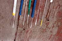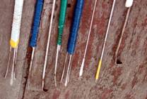 それぞれの機能は、ファイル「磯見」に記したので、それを参考にすれば分かる。 No2.では右端の3本が重なっている。No.4ではそれぞれの機能が分かり易い。先端の材質は、ステンレススティルで、 柄にはビニールテープを巻いてある。年に数日ずつ数回と、余り使用頻度は高くないが、よく手入れされている のが分かる。