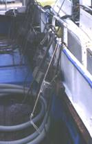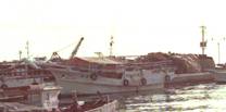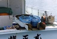 No.2は山口県の瀬戸内海側で縄を揚げていた船の写真である。船首の構造を見ると、底曳網漁船であったと 考えられる。1人乗りである。上・前・左側をテントで囲ってあり、海上交通が輻輳する瀬戸内海で操業 しているが、見張りは考えられない。先の写真では、左舷がわで投・揚縄をするが、この船では右舷で縄を揚げる。 底延縄の場合には右舷がわで投・揚縄をする方式が普通である。