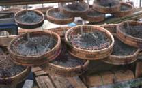 普通は沿岸底延縄でも数時間は浸漬される。しかし、底延縄は着底すると短時間内に魚がかかり、 その後は漁獲は増えない。漁場は浅いし、流れの速い場所に棲む魚の習性を考えると、この浸漬時間で十分だろう。 また、操業時間がこれ以上長引くと、流れに逆らって揚げなければならないし、流されて幹縄が縺れる。 No.6に示すように、両端に十字の先が曲がって尖った細く長い鉄棒の爪が車のようについた1mくらいの 鉄棒がある。これが、この地方のタイ延縄の餌を確保する独特の道具である。 この延縄にはNo.8に示すようなユムシを餌として用いる。この水道の海底には、数本の砂の帯がある。 ユムシはそこに多い。この金具に、自転車のチューブで作った紐を付けてこの部分の海底を曳く。 ゴムが伸びたり縮んだりしながら、この金具は砂地を回転しながら動く。ユムシはその爪に刺さる。 獲れたユムシをNo.8に示す。 No.7はタイ延縄の写真である。幹縄に比べて枝縄は細い。 No.6は機関室より前、No.7は船尾の写真である。ラインホーラは見られない。