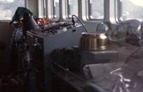 前に向かって左から魚探、レーダ、(通常航海用の)操船コンソール、傾斜計、磁気コンパス (真鍮のカバーに入っている)、ジャイロコンパスのリピータがある。 底曳網漁船に比べて、マグロ延縄船では、僅かに魚探が見られるだけで、水中の情報を集める機器はほとんどない。