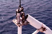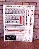 幹縄が一本になると同時にクリップによって枝縄を着脱できるようになった。No.34はその枝縄取付けクリップの 写真である。ABS樹脂製の浮球の直径を約30cmとすれば、クリップの大きさが分かる。なお、浮球はビンダマと 呼ばれるように、ガラス製であったが、1970年代には硬いABS樹脂製に変わり、損耗率が下がった。また、 枝縄がかなりの率で消耗することが分かる。 No.35について、以前にはすべてのブイに目印になる旗がついていた。しかし、現在ではほとんどのブイに 旗はついていない。その代わりに、各ブイには光を反射するソケット(横を向いている短い円筒)がついている。 No.36について、枝縄は簡単な構造であり、その基本構造は現在でも変わっていない。 しかし、既製の部品を組立て方式に変わった。以前は動く部分にはストランドを巻いて摩擦による消耗を 防ぐことも行われたこともある。これにも既製品が用いられる。各部分を連結したり、そのためのループを 手造りで作っていた。しかし、それらは軟らかい金属片で締め付けるように変えて省力化された。 その作業はファイル「マグロ延縄操業」に見られる。 No.36では釣針にはアイが付き、それには小さな錘とガラスの球がついている。ショックアブソーバの ウレタンゴムの部品もみられる。しかし、往復航海中や移動中のように手の空いた時間に乗組員が自分自身の 手で枝縄を組み立てるとすれば、これらを組合わせた複雑な枝縄を乗組員が組立てる余裕があるかどうか疑問である。 また、現況ではマグロ延縄漁業には枝縄作成を外注する余裕があるかどうか疑問である。 枝縄の基本構造は全国的に同じである。しかし、細部において複雑な構造のものを好むかどうかは地方 によって異なる。この見本は繊細な漁具を好む宮崎県南郷漁協において見られた。メーカの見本であり、 それで組立てられた枝縄の見本が右端に示される。大型延縄漁船がこのような枝縄を使用しているのは、 見かけなかった。しかし、50トン以下の延縄船は繊細な漁具を使うので、これらの部品の一部を取入れた 枝縄を使うかもしれない。
