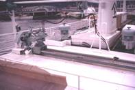 No.24は船尾の幹縄を貯蔵する部分の写真である。 全長100kmを越える幹縄が、この大きさで2重底までの深さに収まる。 幹縄が送られるパイプ(写真の左端を斜めに上がる)、引込む装置(薄緑色)、繰出される縄の入口 (パイプ上端近くの薄緑色のラッパ)が分かりやすい。また船尾の甲板の作業用のスペースが狭くなったこと が分かる。ここに幹縄繰出機が設置されているが、縄の貯蔵庫の影になり写っていない。 No.25は同じ船の船尾をNo.24よりも少し後から撮った写真である。渡板の付根に幹縄繰出機が写っている。 このような小さな装置で投縄作業は大幅に改善された。 餌をつけた枝縄は、現在では、クリップによって自動的に幹縄に付けられるが、その装置が普及したのは はるか後である。 従来型の操業法では、幹縄は一回の操業で1度だけラインホーラのローラによって摩擦され張力を かけられるだけであったが、新しい方法では同様なローラによる摩擦と張力の影響は3回受ける。船が大きくなり、 操船しにくい船型になった。さらに揚縄速度が上がったので、幹縄材料に大きな負担をかけることになる。 操業法の進歩と幹縄材料の進歩のバランスにおいて、幹縄材料の消耗(切断と入替え作業の回数)が シーソーゲームを繰返すことになる。