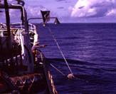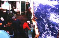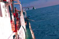 1. 操業写真 No.1―No.5(No.1―No.9) 漁場に到着するまでの間、乗組員は漁具を仕立てる。 漁場に到着するまでの間、乗組員にとって、航海当直以外、特に作業はない。この間に自船で使う漁具を 乗組員が仕立てるかどうかは、時代と船によって異なる。マグロ延縄漁業の景気が良かった時代には、漁具は 漁具会社に発注していた。しかし、経費を節減するために、漁具は往航中に自船で仕立てるように変わってきた。