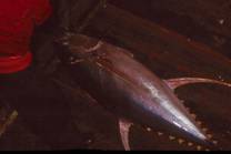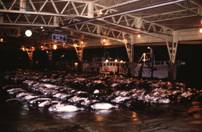 No.26(No.57) 鰓と内臓を切取り、尾柄末端で血管を切って、血抜きをする。(血液が残っていると、 解凍後の肉に黒い線が残る)。 No.27―No.29(No.58、No.59、No.64) 体表面を十分に洗う。 No.30(No.67) カジキ等大型の魚や一部が傷んだ魚は、3枚におろされる。マグロ船の乗組員はこの 作業に熟練しており、両側の肉はほとんど傷めず、背骨にはほとんど肉を残さない。 左上は揚がった縄を船尾に運ぶコンベヤー その下にある短い縄の束は使えなくなった縄を切って作った もので、放血・冷蔵庫内への移動・荷役等のために、マグロの尾柄にかけて吊るすためである。 No.31(No.69) 尾で吊られた魚の血液は脊椎の下にある静脈の前端の切口に固まるので、その部分を切取り、 尾柄を切り取る。 No.32(No.71) 予冷室で冷却し、冷凍倉に積み重ねる前に、グレーズをかけられる。十部に冷えた魚を 真水が入った水槽に入れると、魚の表面は氷で被われ、魚は保護される。これをグレーズをかけるという。 帰港