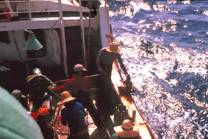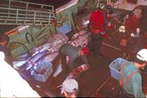 揚縄開始は正午頃なので、太陽を背から受けて浮子の列(すなわち、縄が伸びている方向)は見えやすい。 No.12(No.24) 元ボンデンを鈎竿で引っ掛け、手で引き寄せる。普通、縄は南から北に向けて揚げる (太陽を左舷から受ける)ので、日中の揚縄の写真では影の方向を見れば時間の経過と船の方向を知る 目安となる。更に波の船に対する相対方向を見れば、作業中の風向が分かる。これらに注意しながら 写真を見ることを薦める。(上の記載は北緯漁場に関するものである。太陽を左舷から受け、右舷から縄を 揚げることは変わりないが、南緯漁場では、縄は北から南に向けてあげことになり、南北回帰線の間では 季節によって異なる。) No.13―No.14(No.34―No.35) 画面中央(白い帽子の人の前)にあるものが、ラインホーラー、 舷側右端にあるのが枝縄巻き取り機 縄にかかっている張力、縄がくる方向(上下・左右)、近くの釣針に魚がかかっているかどうかは、 ラインホーラーのハンドルを握っている人(右上の人)が、揚がってくる幹縄をときどきたたいて調べる。 作業のペース(揚縄中の船位の調節)は、この人から操船者に送るサインによって決まる。これは各チームで 最も経験を積んだ人が当たる。 マグロ延縄の揚縄作業は長時間に及ぶので、所定の鉢数ごとに作業分担が入れ替わる。これがマグロ延縄 独特の作業パターンである。 服装は1人ずつ違うので、それを目安にすると、持ち場の入れ替わりが分かる。 ほぼ直線に伸びる縄(浮子の列)に沿って船を少し進め、幹縄のたるんだ部分をラインホーラーで巻き取って 縄を揚げる。縄が揚がってくる方向と俯角は舷側についた3方向プーリーの方向によって分かる。これも揚縄中の 写真を見るときに注意した方がよい。 縄は当時は1鉢ごとに分かれていたので、ラインホーラーの下の台(または箱)に溜まっている幹縄の量で、 各鉢のどの部分が揚がっているかが分かる。それぞれの乗組員が向いている方向と動きに注意すれば、 何が起ころうとしているかが分かる。 No.15―No.16(No.36―No.37) ラインホーラー・3方向プーリー・枝縄巻き取り機・魚を取り込むための 舷門の位置を示す。かなり時化ているので、舷門にはさし板が1枚入っている No.17(No.38) 3方向プーリーを通っている縄の本数に注意すること 1本だけしか見えないとのきは 幹縄だけ、2本見えるときは幹縄と枝縄、3本見えるときは幹縄、枝縄、浮子縄である。(複数本に見えるときは、 影か縄かを区別し、縄の1本か2本の縄が写っているときは問題が少ないが、浮子縄が十分に長い仕立の 漁具でなければ、3本写ることはない。) 各枝縄の幹縄との連結点がプーリーを通過すると、縄は2本通ることになる。クリップを握って枝縄をはずし、 画面下端中央に見える枝縄巻き取り機で巻く。この写真では2本であり、幹縄と枝縄が揚がっている。 ブルワークトップは縄とすれて傷まないように補強してある。 No.18(No.39) 左にサメが揚がっている。(ヒレは乾かして売り、乗組員の収入になる。)右から2人目は、 枝縄を幹縄に取りつけるクリップを握って、枝縄を外しかけている。 No.19(No.42) マグロを引揚げる。肉の部分を傷めないように、手鈎は鰓孔等に引っ掛ける。 No.20(No.47) 揚縄作業は夜間に及ぶ。これからNo.24までは夜間の揚縄の写真である。 右の人は揚がりつつある幹縄をたたいて、張力を調べている。左の人は枝縄を外しかけている。 3方向プーリーは横を向いており、幹縄は横から上がっている。すなわち、船はしばらく前から停止しており、 まだ前進するまで少し時間がある。(すなわち、行き足はない。)枝縄が揚がってくる方向は斜め後ろから であるので、この枝縄に魚がかかっていることが分かる。左の人はその枝縄の先に注意している。 No.21(No.48) 枝縄の巻取り 枝縄の巻き取りは始まったばかりである。3方向プーリーは前の方を 向いているので、あとしばらくすると船は数十秒間前進する。 No.22(No.49) 枝縄と枝縄の間ごとに幹縄はコイルされている。その間に枝縄巻取り機でコイルした枝縄を挟む。 No.23(No.50) ラインホーラーの後にある短い縄は、使えなくなった縄を切って作ったもので、 モッコと呼ばれ、幹縄と枝縄を1鉢ごとにまとめて縛るためである。 No.24(No.51) 揚縄作業が終わり後片付け 漁獲物処理 漁獲物処理の写真を見るにあたり、甲板の板は前後方向なので、それに着目すると、カメラを向けた方向が分かる。