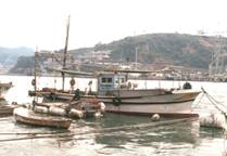 これらの船でも、前半分が住居になっていることが、低い屋根型のテントから分かる。 左の船では船尾にスタビライザが付いている。 浮桟橋には鉄棒に多数の円形鉄板製のツバを付けた桁が見られる。 一本釣を行う漁船では、それに住み込んで、他の地域を根拠に操業することが考えられる。しかし、 底曳船が他の地域の地先で操業するとは考えにくい。しかし、それらの船でも、船首付近の1/3は住居に なっている。すなわち、船に住み込んで各地を巡る家船から、陸上に定住して漁業をする中間のステップ の可能性が見られる。