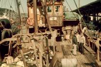 元来の型の以西底曳網漁船は乾舷が低く、中央に船橋があり、耐波性が優れた普通の型の船である。 船首楼の下が甲板部員室、甲板は作業場で投揚網作業と漁獲物の選別を行う。その下が魚艙になる。 甲板には前端にワープの一部を巻き取る大きなドラムと機関室の両側にワーピングエンドがある以外は、 ウインチ・ボラード・ギャロスを含む一切の漁労設備はない。 船橋が黄色に塗ってあるのは、日本船を意味する。船橋には磁気コンパスと人力によって操舵する大きな 舵輪以外には何もない。終わり頃には一部の船にはレーダと魚探がやっと見られるようになった。 船橋の下は通信室(主船)か幹部乗組員の居住区(従船)である。その後は機関室で、その上には、 機関開放修理・通風・明かり取り等のために、構造物は何もない。 その後が食堂で、その下は機関部員室、船尾は作業用の狭い甲板がある。 No.3は廃船前の船の写真である。当時の船の水線上構造や甲板上に設置されていた漁労設備が分かる。 ワープはコンビネーションロープである。2隻の組みで3本持つ。投揚網は2隻の船が交互に行う。 片側のワープを繰出し終わると、船のローリングを利用し、右舷側を越して網を投入する。したがって、 トロール船や以西底曳網漁船はよくローリングをするように作られている。これは、荒天でも航行できること を意味する。無風状態のときよりも、ある程度の風浪があるときの方が作業しやすい。 網の投入を終わると他方のワープを繰出し、そのワープを他船に渡し、2隻で1統の網を曳く。 したがって、網口を広げるためにオッターボードは使わない。 所定の時間、網は曳かれる。この間に漁獲物を整理する。2隻の船が等速度で一定間隔で網を曳き、 終わりにはお互いに近づいてワープを渡さなければならないので、絶えず相互の緊密な連絡が必要であるが、 それには無線電話等は使われなかった。 曳網を終わると、ワープを受取り、船尾にあるローラを越えて2本のワープを巻込む。(このロ−ラは 短い柱の上にあり、それを牛の角に見立てて、bull trawlerと呼ばれた。)この間にワープを渡した船は離れる。 ワープは、食堂と機関室の壁面上端にあるガイドローラを通って、機関室の横にあるワーピングエンドで 引かれる。網がついたワープを曳く動力は、これしかなかった。ワープの始めの部分は船首楼の下にある ドラムに捲込まれる。この作業のために両舷に沿って甲板は十分な幅が空けられている(No.3)。 このドラムは直径が小さく無動力であったが、後には動力化し、直径は船首楼の下一杯まで大きくなった。 ワープのそれ以後の部分は、人力によって揚げられる。ワーピングエンドに熟練した乗組員が立ち、 残りの乗組員は甲板に並んで、ワープをコイルする。2隻の船が交互に揚網するが、平均2時間曳網する としても、乗組員は毎日6回ずつこの作業をしなければならない。 網はワーピングエンドから前檣の上端にある滑車を通るワイヤによって引揚げられる。網は船の ローリングを利用して右舷から甲板に取込まれる。この作業は、船がある程度ローリングする方が進めやすい。 網が海面近くまで揚がってくると、右舷から風を受け、風圧によって船を網に乗上げないようにしながら、 網を揚げる。 この作業が終わると反対の船が投網を始める。曳網中には、網を揚げた船の乗組員は漁獲物を整理し、 もう1隻の船の乗組員は休憩する。