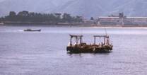 網から見て左半分を揚げている船の写真である。2隻の網船の間は少し離れている。この網船は揚網しながら 次第に反対側の船に近づく(船首は右に向いていることに注意)。袋網は手前の白いブイまで伸びている。 揚網が進むに従って網の目合いが次第に小さくなって行くのが分かる。