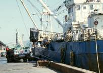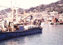 従来の乗組員が多く主に作業は人力で行うという操業形態から、漁労作業におけるは動力の活用と、漁労長の 勘に代わる(あるいは補助として)船橋における電子機器の充実のような抜本的な近代化が起こった。この変化の 初期の例として、No.1からNo.15までに、当時の船団の写真をあげる(以下、当時というのは、70年代前半を指す)。 普通この船団は、網船1隻、灯船3-4隻、運搬船1-2隻で構成された。このような船団の構成は、多数の小さな 船が共同して巻き網漁業を行っていた伝統の残りと、網船のトン数が法的に規制されていることの結果である。 外国でも、地中海沿岸のような伝統的に多数の小さな船を使用して巻き網を行っていた地域では、これに近い 船団構成が見られる。 No.1は船団が入港する光景で、画面左の白い船が灯船、右の船体がブルーの2隻が運搬船である。網船と何隻かの 灯船は先に入港してしまったので、この写真には写っていない。 No.2とNo.3は、網船の写真である。航走性能に重点が置かれているので、巻き網漁船としては船体が長い。 この船型は、当時の下関におけるもう1つの基幹産業であった以西底曳網の漁船と似ている。船首部に居住区を集め、 それ以外の部分に低く長い作業甲板を設ける方式は、現在では、下関を根拠とし全く異なる業種である沖合底曳網 漁船に受継がれている。 No.3はNo.2の後半の拡大である。後のマストより後方で網を扱う。 ブームに吊られた網捌き機と船尾にネット ホーラが見られる。右舷操業である。右舷は船体の陰になっているので、サイドホーラの有無は、これらの写真では 分からない。 No.4の左は網船、右は灯船である。ネットホーラは、画面左端より左にあり、網捌き機は網の上に乗っている スキフらしい白い小舟の蔭になっている。右舷操業で、サイドホーラは当時でもすでに装備されていた。網には 浮子が密につけられていることが分かる。これが、巻き網の特徴の一つである。右舷の内側に見られるように パースリングブライドルは長い。水中において網地を動かすよりもブライドルを動かす方が同じ大きさの力でも 早く動かせるので、網底部を比較的早く閉めるためだろう。 船橋の前にパースダビットが見られ、大きなブロックを吊っている。この船は幅が広く、水線上構造は低い。 No.2・No.3と同時に撮影した写真である。同じ年に同じ漁港において見られた同じ業種に従事する漁船でも、 一方は長く高いが、他方は幅が広く低いことは、船主(あるいは漁労長)の好みによるのだろう。それぞれの船の 出身港における伝統と気風の影響を引継いでいる可能性も無視できない。一方は漁場が遠いことと探魚中の航走に 重点を置き、他方は投網中の旋回性能と揚網中の安定に重点を置いた構造になっている。 漁業が急速に発展する時期には、漁業には活気と資金があり、それぞれの船主(あるいは漁労長)がアイディアを 出して好ましいと思う船を作るが、次第にある船型に収斂する。これらの写真は、この拡散段階における様子を 捉えたといえるだろう。 右側の船は伝統的に灯船(ヒブネ)と呼ばれ、長時間集魚灯を点灯して魚を集めていた。しかし、操業法が変わり、 高速で走回りながら魚探を使って魚群を探す(小さな魚群を見過ごし、採算を取れそうな大きさの魚群が見つかれば、 網船に連絡する方式)になった。したがって、ある時期にある地方において呼ばれたように、魚探船と呼ぶ方が 作業の実態を表す。 通信・船位測定・探魚に多種多様の電子機器を活用することが、日本における近代漁法の特徴である。その目安 として網船の船橋の上に見られるアンテナをNo.5に示す。当時でも、新船の建造費の約1/3は電子機器に当てられて いたと言われていた。アンテナの数は船位測定機器と通信機器の数を表す。しかし、当時は電波航法計器はあまり 発達していなかったし、それは底曳網漁業におけるほどは重要でない。水温分布図を配信・受信する装置は現在ほどは 発達・普及していなかった。したがって、ほとんどは通信用だろう。その多いことが分かる。現在の網船では、 この写真が示すよりもはるかに多このアンテナが見られる。網船に搭載されている機器の主力は、当然水中情報を 集める機器であるが、それらは外からは分からない。 No.6はスラスタの操作盤の写真である。 スラスタとは、船首(または船尾)付近に、左右に通じるトンネルを設け、その中でプロペラを回すことによって、 船首(または船尾)を目標から遠ざけるか近づける装置である。現在では、フェリー等にも普及しているが、 当時としては珍しく、個人経営の100トン以下の漁船に装備されることは考えられなかった。 巻き網漁業では、投網後に船が横方向に流されて、網に乗上げることと網から離れ過ぎることは、好ましくない。 これを避けるために、灯船や運搬船を用いて網に対する網船の位置を調整する。この作業を、巻き網では裏漕ぎという。 日本の巻き網は船団操