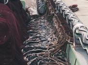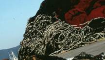 揚網が進むに従って、パースリングブライドルの連結を外し、環はピンに残され、ブライドルは網本体に ついたままネットホーラから網捌き機を通る。 揚網が終わると、環綱を環に通し、ブライドルと環を1つずつ連結する。これで、投網準備が終わる。 この写真では、環に環綱は通されていない。