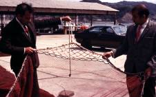 これは沿岸巻き網としては大型に属し、環綱はワイヤである。(海外の巻き網では、環綱はワイヤのことが多く、 沈子とパースリングブライドルはチェーンのことが多い。) 写真に示すように、パースリングブライドルはかなり長い。すなわち、環と沈子綱の間には、パースリング ブライドルのカーテンができる。環締めの段階において水はここから抜けやすいので、環を締める力は網裾を 閉めるのに有効に働く。縁網に大きな目合いを用いることとともに、網裾の沈降と環締めを早めるように工夫 されていることが分かる。