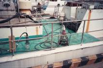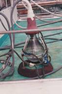 環綱が走るので、支索はとれない。その方向は、写真に見られるように舷側にある角型のソケットによって 決まる。(これと同じように支索を用いず、ダビットの方向を変えて固定する方式は、例えばアメリカのカニ カゴを揚げる装置でも見られる)。