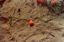 網糸はかなり太い。これは細い糸では直射紫外線による劣化が早く、しかもサンゴ礁にかかって破れやすいため である。ナイロン網地でもサンゴ礁にかかると破れ、棉の網地よりも高価なために、ナイロン網地を好まない漁師 もいる。 綿糸手編みの網地に、細枝に穴をあけた浮子、素焼きの沈子をヤシの繊維で作った縄に付けた刺網も見られた。 中には対岸のSudanより買ってきたものもある。(紅海を挟む対岸との交流はsambukやzerogクラスの船で普通に 行われている。)