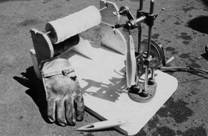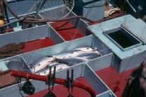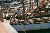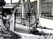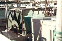 No.54 No.46 典型的なdrum gillnetterである。ドラムは木製、スタビライザー用のブームは見られるが、曳縄の 設備がないのは珍しい。 何人かで組になって扱うと、休暇のやりくりが面倒なので、レジャーボートは1人乗りになる。普通はペダルを 踏んでいるときだけドラムが回り、足を離すとドラムが止まる(dead man control)ようになっているので、 1人乗りでも網から漁獲を外し易い。船尾の先端から網を引揚げるので、船は自動的に網の方に向けられる。 スクリューのすぐ後に網があるので、揚網中に網に近づけるか網に力をかけないなために、後進はかけない。 したがって浮子綱に力をかけて船を引き寄せることになる。短時間の前進微速と停止を繰返しながら、たるんだ 部分の網を取込むのが、普通の揚網法の基本であるが、ここでは基本的な考え方が違う。 No.47 ドラムは鉄板製 No.48 自動車のギアボックスをつけている。 No.49 網をドラムに巻込むために浮子は紡錘型で、一般の流し網に比べてその数は少ない。その代わりに、 浮子縄には浮力のあるブレードを使っている。 No.50 軽合金の鋳物のドラムと、その操作盤(主機の変速もできる) No.51 普通のdrum gillnetterでは、船尾にドラムがあり、前進しながら投網し、船尾から揚網するが、 この船では前にドラムがあり、後進しながら投網し、前進しながら揚網する。FRP製のドラム このように 種々の嗜好をこらすことがアメリカのレジャーボートの特徴の1つである。 左舷前寄りに見られる灰色の柱は陸上電源をとるためで、桟橋には数メートルごとに見られる。 No.52 当時としては最も進んだdrum gillnetterである。ドラムと船体はFRP製。ロッドはステンレス製、 小さいがレーダーを備えている。船内には台所があり、客間の感じである。普通の船では漁船に近い感じであるが、 この船では洋上サロンの感じである。 No.53 2月で整備中 No.54 自分で網を仕立てるのもレジャーの一部である。Monofilamentの網は禁止されているので、網地は軽い 縒りをかけて樹脂で固めた糸で作られている。 曳 縄