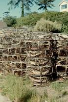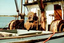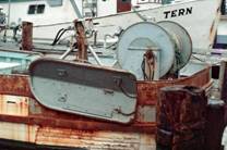 No.8 No.2 中央の2隻は大学の調査船 2隻のトロール船は稼動している。 No.3 沿岸カニカゴ船 No.4はその漁具 カゴは漂砂で埋まるので、1カゴずつブイを付けて設置する。 砂に埋まって揚がらなくなると、ブイラインを巻上げられるだけ引揚げ十分に張り、それに沿わせてホースを入れ、 ポンプで砂を吹飛ばして揚げる。延縄方式にできないのは、そのためである。 No.5−No.7 沿岸トロール船 船尾の網巻き込みドラムの構造は、先に記したものと同じである。オッター ボードは鉄製の開いたL型で、これは北米の小型トロールでは最も普通のもので、現在でも広く使われている。 No.6とNo.7に示すウインチシステムによって、2人で操業できる。ワープには日本ではワーヤーにグリスを塗り こんで使うが、ここではホースに通してある。その欠点はいろいろ考えられるが、このような方式にしてあるには、 それ相応の理由があるのだろう。 No.8 曳縄のダビットとウインチ 片舷数本ずつの縄を曳くので、曳索ごとに付ける鉛の球の大きさを変えて 曳航深度を変える。ダビットの下にはそのソケットが見られる。 No.9 ここの湾内では、カキを地蒔きで養殖する。それを収穫するためのドレッジャー 水温が低く産卵 しないので、種カキは毎年日本から輸入するとのことであった。 Newport(44°39’N、124°04’W、Oregon州)