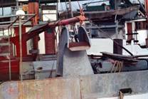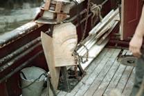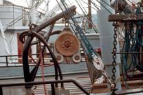 No.14 No.7 船尾に大きなドラムがあり、普通は泥場用と荒場用の網の2カ統を巻き、漁場によって使い分ける。 ドラムは油圧駆動。 身網は長く、グランドロープは比較的細い。日本ではほとんど見られない軽合金の浮子を 使う。オッターボードは鉄製の開いたL字型の平板 漁獲物はコッドエンドから直接魚倉にあけられる。魚倉では、冷やした海水のシャワーを上からかけながら 保蔵する。加工場はここから離れたところ(旧商港の桟橋にもあった)にあり、そこに直接着岸して水揚げされる。 No.8 トロールにも巾着網にも使われるここでは最も普通の型の船である。これはトロールに使われている。 船橋は著しく前にある。その下が居住区、後が食堂である。1つのドラムに網が2カ統巻いてあるのが分かる。 No.9 スタビライザー トロール船ばかりでなく、巾着網船やdrum gillnetterでも使われる。曳縄のポール よりもやや太く短いブームが両舷にあるのは、スタビライザーを下げるためである。スタビライザーとはこの ようなもので、あまり大きくない(バケツ等から大きさの見当はつく)が、右に見られるチェーンでブームから 水面直下に下げると、船はほとんどローリングをしなくなる。 No.10 ドラムに巻かれた網 コッドエンドは平行なロープのところどころを太い撚糸で結んで網状にした カバーで被われる。船の索具として、動索にはワーヤーロープが使われている(最近ではブレードが使われるよう になった)が、支索には細い鉄ロッドとチェーンを組み合わせて使われるようになった。(制作費と保守の労力を 節約するためには、現在の日本ではこのような発想の転換が必要かも知れない) No.11 ドラム・オッターボード・トップローラーを示す。 No.12 L字型オッターボードの調整部、網を巻きこむドラムの内径等を示す。 No.13 トロール船の甲板 ロープを太い撚糸で結んで作ったコッドエンドの被い(スレ)が分かり易い。 No.14 網の一部 軽合金製の浮子・ヘッドロープが塩ビチューブで被われていること・ロープで作った スレ等を示す。 カニカゴ
