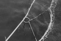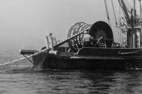 No.62 No.61 Scallop(ホタテガイ)が漁獲されるようになったので、ミシシッピ河口から回航されてきたdragger No.62 このような網を左右1統ずつ曳く。網は海底とすれるので、平行に走るロープのところどころを太い撚糸 で結んで網状にして背網とする。腹網は鉄の輪を組み合わせて作る。 Tender boat