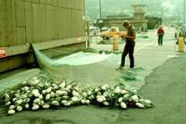No.12 No.2−No.12 魚レストランの裏の船溜りの写真である。ここでは、内陸から海岸に来た人に対する1つの サービスの型が見られる。No.2とNo.3に見られる船はSan Franciscoの町を海から眺める観光船である。これらの 船の両舷のブルワークトップには釣竿の受け台があり、観光をしながら曳縄をする。(日本ではこのような楽しみ 方は考えられない) No.3 左の船では観光用の曳縄がよく分かる。 No.4 手前の船でも観光用曳縄の設備が見られる。2隻目は漁船、3隻目は観光船 No.4−No.8 漁船 レジャーボートの立派さと観光地であることから全く考えられないような粗末な漁船が、 同じ船溜りで観光船に混じって見られる。1人乗り。漁場との往復航中に使う曳縄を装備している。底延縄を使う。 縄の構造はNo.6に見られるように、日本の沿岸で使われているものとほとんど同じである。どの船にもライン ホーラーが見られないが、その理由は考えられない。 No.9−No.12 魚レストランの裏から続くレジャー漁船の船溜りの写真である。 No.9 右上はロッカーの列で、このようなものが何列も並んでおり、レジャー漁船の多いことが伺える。専業の 漁船よりもレジャー漁船の方が費用をかけていることは納得できるが、それにしても、漁船との格差が大きい。 左上の緑の建物には水産会社の看板が見られる。日本と異なり、自社では漁業をしない。レジャーボートを含む 漁船から魚を買い取り、氷詰めにして送出す。背景にGolden Gate Bridgeが見られる。 No.10 曳縄によるサケの漁獲 San Franciscoは北緯38度近くであるが、寒流が流れているので、曳縄でサケ が漁獲される。乗っていたのはNo.11の遠景に見られる2人である。 No.11 水産会社の水揚げ場(No.9で見られた店) 桟橋の上にあり、漁船が直接横着される。漁獲物はカン に入れて、簡単な電動巻き上げ機で引き揚げられる。レジャーボートで漁獲されたサケを1尾ずつ体長と体重を 計測して買取っていた。末端においても資源管理の考え方が行き届いていることが分かる。 No.12 これもレジャーボートの漁獲で、乗っていたのは高校の数学の先生だった。