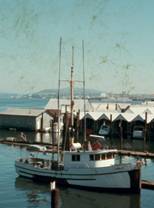 No.1 ここの代表的な漁法は巾着網である。これは缶詰工場に原料を供給するために、ここ(San Pedro)で考え出された 漁法である。日本の巻き網は、網船の他に数隻の灯船と運搬船よりなる船団で操業するが、アメリカの巾着網は単船 操業である。日本では1船団の操業には数十人が必要であるのに対してアメリカでは小型船では4・5人、大型船でも 20人以下で操業できる。網の仕立を含め多くの点で異なる。 No.1 San Pedro には、この写真に示すように、大きく分けると2種類の巻き船がある。その1つは、左に見ら れるような小型船で、日帰り航海によって、イワシを漁獲する。網はpower blockで揚げられるが、中にはturn table 式の船を改造した跡が残っている船も見かける。対岸にはやや大型の巾着網船が見られる。