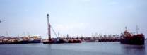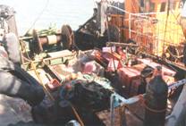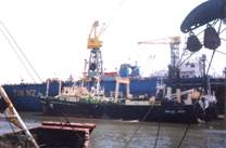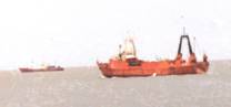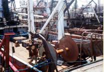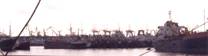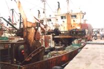 No.1-70 No.1-1−No.1-8 離れたところに係船されている漁船団 これらは主に東欧系諸国のトロール船で、魚価 (主にイカ)が低迷していたので係船中であった。これらは遠くに係船してあり、写真を拡大しても細部は 分からないが、その多さを示す。 No.1-7 前景右端は韓国のトロール船で、この船はNo.1-12に示す。 No.1-8とNo.1-9は続く。No.1-8の右端は台湾のマグロ延縄船である。 No.1-9 左の4隻のうち、白い3隻はマグロ延縄船で、自動イカ釣機を付けている。左から3隻目の船体が赤い船は、 色から考えてUruguay船籍の船である。船尾の構造によれば、元来大目流し網漁船であったが、撮影当時は自動イカ 釣機を装備していた。 No.1-10 Uruguay船籍のトロール船 No.1-11 ソ連のトロール船 No.1-12 韓国のトロール船 No.1-13 前景と遠景の右はUruguay船籍のトロール船 No.1-14 サイドトロール船 トロール船は約30年以上前に、サイドトロール船から船尾式トロール船に 変わったので、稼動中のサイドトロール船を見る機会はほとんどなくなった。しかし、これらは現在でも稼動 している。 No.1-15 この写真で見られるのは、すべて船尾式トロール船である。 以下はほとんどが船尾トロール船である。大部分は岸壁に船尾着けになっているので、全体の船型は分からない。 トロール船は、ほぼ同じような網を使って同じように底魚類を漁獲するにもかかわらず、建造された国によって 概形が異なり、異なった発想法によって細部が造られ、それぞれの船の構造は特徴的である。 No.1-16 No.1-9の右に続く。手前の船体が黒く、船尾だけが見られる船は韓国のトロール船である。角型の船尾 だけが見られる(1隻は白、他の1隻は赤)船は元来マグロ延縄船と大目流し網船である。赤く塗られているのは、 アルゼンティン船籍の大型船かUruguay船籍であることを示す。 No.1-17 手前から3隻目の赤く塗った船は、船型から見るとUruguay船籍のサイドトロール船である。横長楕円 オッターボードを使っている。しかし、サイドトロール船として不可欠のギャロースが前のマストの舷側にないので、 サイドトロール船を使って船尾で曳網すると考えられる。 No.1-18とNo.1-19 両舷側には隔壁があり、風波から遮蔽された甲板で作業ができるようになっている。これは 北欧のトロール船の特徴である。船橋は狭く、あまり多くの計器類を装備できないと考えられる。 No.1-20 英国のトロール船で、スタンガントリー付近の構造が分かる。舷側が高く、風波から遮蔽された甲板で 作業できる。トロールウインチは居住区のすぐ後ろにあるが、その横は空いており、袖網を前の方まで引き込むこと が考えられる。 No.1-21 ソ連のトロール船 トロールウインチのコントロール室は後方にある。画面の左端近くの構造の機能 は分からない。 No.1-22 船橋は低く、横に長い。トロールウインチは高い位置にある。 No.1-28 船尾の近くに高いガントリーがあり、それで揚網する船の船尾付近の構造。 No.1-29 自動イカ釣機を装備している。 No.1-30 自動イカ釣機を装備した韓国のトロール船。 No.1-31 ブラジルに回航途中の漁船(もとは日本で底曳漁業に使われていたが、ブラジルでは延縄船として 使う予定であるとのことであった。しかし、底曳船と延縄船では、異なった性能が要求されるので、疑問が多い。 関係者がそこまで考えているのか、知っていても、このようなことにしているのかは、疑わしい。)移動中である ので、パナマ船籍になっている。 No.1-32 もとは日本のマグロ延縄船であったが、船籍をUruguayに移してイカ釣に従事する。船首先端の輪は イカ釣の際にパラアンカーを揚収するために使う。 No.1-33―No.1-46 先に示した船よりも小さく、Uruguay船籍のトロール船である。ほとんど1隻ずつ構造が異なり、 したがって網の操作が異なる。 No.1-33 スリット付きの横長楕円オッターボードを使う。本来は船の最後端近くにあるガントリーを使って 揚網していた船だが、船尾にドラムを付け、現在は網の大部分をそれで揚げ、コッドエンドだけをガントリーで 揚げて、漁獲物は中央の樋で前にある魚倉まで運ばれると考えられる。 No.1-34 船尾にドラムを装備する。コッドエンドだけは、この写真の前の端近くで揚げられる可能性が、 ワイヤーの走り方から考えられる。 No.1-39 このジョウゴの機能は分からない。 No.1-41 右舷手前の漁具は底延縄の可能性がある。 No.1-44 一般に、トロールウインチの軸は正横方向で、ワープは後に伸びる。しかし、この船ではトロール ウインチの軸は船首尾方向で、ワープは左右に出され、舷側で90°曲げて後方に伸ばす。フロリダ型ダブルリガー のワープはこの様であり、同時に2統の網を扱う。しかし、この船では2統の網を扱うようになっていない。 ウインチの軸がこのような方向に走るもう1つの漁法は米式巾着船である。この船をトロールに転用したと 考えられない。もう1つの可能性は米式巾着船のウインチだけを転用したことであるが、その可能性は疑わしい。 No.1-47−No.1-54 Mont