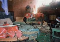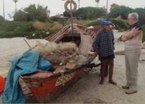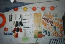 No.2-41 No.2-38−No.2-41 Aguas Dulces 付近の漁船 No.2-38 底延縄を使う。その構造と、使用前に縄を繰ってあることは、日本における使い方と変わりない。 帆走設備を備えているが、船尾はtransom sternになり、補強してあるので船外機を付けると考えられる。ライン ホーラーはない。 No.2-39 餌懸け 餌には魚の切り身を使う。 No.2-40 仮設小屋と漁船 No.2-41 餌懸け 餌には魚の切り身を使う。手前には底延縄の錨に使う錘が見られる。