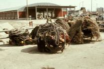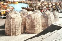 No.52 タイカゴの写真である。これはMar del Plataの名物とも言える漁法である。 釣鐘型で高さは1m以上ある。このままでは沿岸漁船に積みにくいが、折りたためない。餌として巾着網の 撒餌に使ったような腐った魚が使われる。 観光客が多いので、小型のものを土産として売っていた。