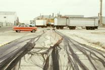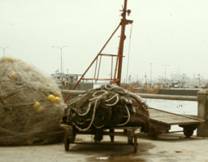 No.17 中型トロールは楕円型オッターボードを使う。 これは沿岸漁船の船溜りの外側にある中型船専用の岸壁の一番奥の写真である。この船溜りには、かなり古い トロール船が繋留されている。初めて行った’83年には、このようなひどい船が稼動中なのか疑問に思ったが、 ここにいる大部分の船は最後に行った’92年まで、ほとんど動かなかった。この型の船は’84年にはすでに平均 船齢が19年だったという統計がある。したがって、動いている船が故障すると修理をする部品がなく、このような 廃船から外して使わなければならないとのことであった。 遠景の白い船は冷凍魚運搬船で、左端には冷凍魚を運んできたトラックが見られる。