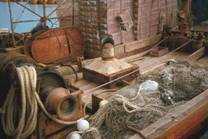 No.16 台車に乗せられているのは、ランパラネットの魚捕、その左横に積まれているのは、その身網と袖網である。 ランパラネットはNo.34からNo.47に示すように広げると大きいが、大きな袖網は網が大きくても細い糸で作られて いるので、積重ねると、この程度の大きさになる。
