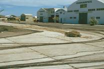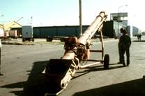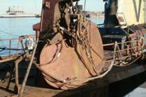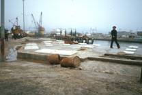 No.54 トロール船に砕氷を積込む装置 これはNo.19の中央に見られたハッチに被せられている装置につなげる。 遠景はNo.11とNo.12の中型船用のトロール網が見られた広場である。