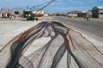 No.10 No.11とNo.12は全長25m以上の伝統的沖合漁船クラスが使うトロール網の写真である。沿岸漁船が使う網と異なり、 ヘッドロープには浮子が多い。浮子は、日本ではほとんど使われていない軽合金製である。 グランドロープは目立たない。しかし、これは使っている網を陸に揚げて修理しているのか、古い網から使える 部分を集めて仕立なおしているのか疑問である。この写真を撮ったころは、No.14とNo.29に示すように、漁業は 有り合わせの網地で網を修理しなければならないほど深刻な経済危機の影響を受けていた。 No.12の遠景には荷役用の簡単な移動式クレーンが多数写っている。日本では漁獲物の荷役は主に船のウインチ を使うので、このようなクレーンは見られない。日本では荷役が終わるまでは乗組員の仕事になっているが、 沿岸漁船を除くアルゼンティンの漁船では、入港すると乗組員はすぐに下船し、漁獲物を降ろし、補給品を積み込む のは他のチームの仕事になっている。このような仕事の分担の違いがここに反映していると考えられる。