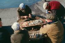 No.47 底延縄に餌を付けている。この漁業には、ツバがある独特の型の大きなカゴを使う。アルゼンティンでは 底延縄はほとんど使われていないので、このカゴは地中海岸からの移民がこの漁法といっしょに持ってきた ものだろう。 枝縄は太く、多い。カゴの内側に沿って輪があり、それに釣針をかけてある。釣針にはアイが付いている。 餌をつけた釣針はツバの部分に載せられるが、餌はツバからはみ出さない。餌は頭掛けにする。小さなイワシ は1尾のまま使われるが、大きなイワシは半部に切って使われる。尾部は針から落ちやすいがそれでも使っている。 漁師は集って餌を付けている。予備の鉢が近くに見当たらない。釣針が多いが2人の組が1回に1鉢しか 使わないかどうか疑問である。しかし、基本構造は日本の沿岸や遠洋で使われる底延縄と異なり、大型の底魚類 を対象とするなら、1回に1鉢ということも考えられる。