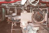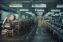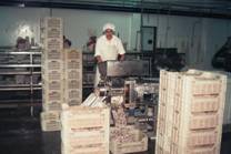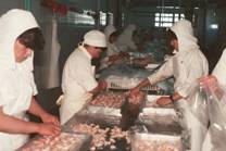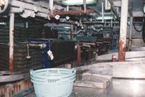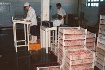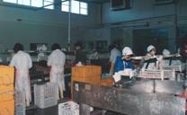 No.53 Puerto Deseadoには10を越える加工プラントがある。パタゴニアは人口が希薄で、加工プラントは作業員の 確保が難しいと考えられる。しかし、当時は深刻な経済危機にあり、北の地方から職を求めてパタゴニアまで 出稼ぎにくる人が多く、人手不足のために操業を縮小しているプラントは見られないとのことであった。 Buenos Aires等の大都市の雇用が好転するとどうなるか疑問である。 近くのGolfo San Jorgeでエビの漁獲が多かった。作業をしている人の中でエビを扱っているのが目立つので、 エビの重要性が分かる。しかし、エビの漁獲量は年変動が激しい。 次々にプラントを案内されたので、写真をプラントごとに区別しにくいが、まず建物を写して次に内部を写した。 建物には、ここが羊肉の積出港であった時代の駅舎や羊の集荷場を利用したものと、最近に作られた簡単な レンガ造のものがある。