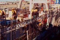 No.10 No.11からNo.53までは、大型船の岸壁に着岸していた船を示す。 同じスタントローラでも、地域によって建造の基礎になる考え方が違い、それが型になって現れていることは 興味深い。 これらの船は、3つに大別される。第1は日本と韓国を中心とした東洋系のスタントローラで、かっては北転船 と呼ばれベーリング海で稼動していた船である。ほとんどはアルゼンティンに売却されたか、合弁事業の船で アルゼンティンに移籍し、船体は赤く塗られている。 イカ自動釣機を備えた船が目立つ。これはNo.61に示すように、自動釣機によって漁獲されたイカは傷みが少なく、 別に扱われるので、昼間にはトロールを行い夜間には自動釣機によってイカを漁獲する傾向が’86年以後に 見られるようになったためである。