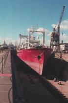 第 6 部 25-11 アルゼンティンで見られた元日本漁船 各国による200浬経済専管水域の実施に伴って、かつて北洋で活躍していた底曳船を主体とする日本の漁船団は 出漁先を失った。 世界で最後に残された大陸棚と言われたアルゼンティン沖は、操業先として注目されている。船団の一部は種々 の型で進出を試みた。 ここにそれらの例をあげる。 No.1からNo.3は、それらのうちで大型スリミ工船の六甲丸・春日丸及び金剛丸の写真である。これらは現地に 合弁会社を作り、稼動している。しかし、アルゼンティン海域内では、アルゼンティン籍の船しか操業できない ので移籍し、ここの法規に従って船体は赤く塗ってある。また、アルゼンティンの船はアルゼンティンの海技免状 がないと動かせないないので、士官はアルゼンティンの免状に切りかえている。 一般船員の中には所定の割合でアルゼンティン人を乗せなければならない。これらの船に乗っていた人にも Mar del Plataではよく出会った。 No.1の中央に写っている赤い船がその1隻である。Buenos Airesのドックに入っていた。右上の隅に写っているのは、 繋留中の旧ソ連の漁船である。 No.2の右遠景は繋留中の旧ソ連の漁船である。No.3は船名部を拡大すると金剛丸であったことが分かる。