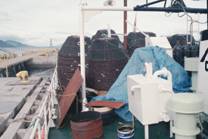No.6 以上はアルゼンティンに移籍して稼動中の船である。 No.7からNo.14までは、日本の中小企業の持ち船である。これは正式に合弁事業の許可が下りる前に日本を 出港してしまった。この点について企業主の判断の甘さが感じられる。現地に住んでいる日系人の話をどこまで 信じるか、仲介する人の選び方等に関して問題を感じられる。 かなり良く整備され、多くの資材を搭載しているので、大いに期待して出漁してきたことが伺える。 ここで漁獲されたカニは日本に輸入されており、No.10からNo.14に見られる装備では、カニ漁を考えているらしい。 合弁の相手の日系人は見つかっているものの、許可の下りる見込みはたたず、船番を残して数ヶ月間、 南米の最南端のUshuaiaに係船されたままになっていた。No.10に写っている白い船がこれで、手前の黄色の船は 地元の沿岸漁船である。その先の海がBeagle海峡である。 船尾には日本の国旗を揚げ、船体はまだ赤く塗り替えられていない。 番人はスペイン語が全く分からず、話相手はUshuaiaにいる日本人だけで、船の中にこもっていて、我々に対しても ほとんど口を開かなかった。 Ushuaiaにいる日本人と合弁会社の相手となる人の両方から話を聞いたが、話は食い違っており、真相はわからない。 その後の消息は不明である。