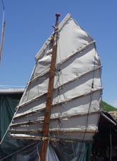 3. 帆のはらみを抑制したりするために、斜め方向に幾つもの補強材としての竹などが取り付けられたり、あるいは割り竹