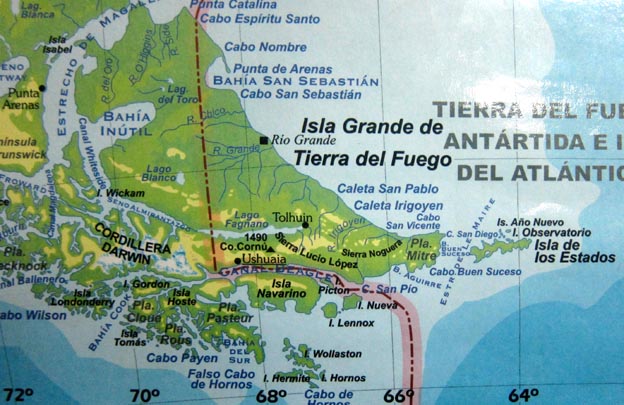 そして、南米大陸はそのマゼラン海峡にて尽きことになる。 マゼラン海峡の南に位置する最大の島が、アルゼンチン領のティエラ・デル・フエゴ島 (Tierra del Fuego, 「火の大地」 という意味) である。 その島の南側にアルゼンチン最南端の港市ウシュアイア(Ushuaia)がある。ビーグル水道(Canal Beagle、Beagle Channel)に面する 海峡の町でもある。 ビーグル水道をはさんで南側に横たわるのがチリ領のナバリーノ島(Isla Navarino)である。同島以南にもチリ領のいくつかの 小さい島嶼が散らばるが、その島嶼の最南端にかの有名なホーン岬(Cabo de Hornos)がある。