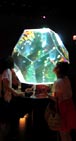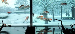 舞台と融合して織りなす動的で幻想的なアートがある。 どこにでもある普通の形だが大きさが半端でない金魚鉢、そこに何百匹という凄い数の金魚たちが、照明に合わせるかの ように踊り狂う、その乱舞が圧巻で唖然とさせられる (画像1)。 あるいは、12面体や18面体の総ガラス張りのダイヤモンド形アクアリウム内で、魚たちが変幻自在に舞う (画像2)。また、 屏風型アクアリウムの「光と影の水中舞台」で無数の金魚たちが優雅に舞う。幅8mもある長大薄型テレビ型アクアリウム内の 水中舞台では、背後のスクリーンに映し出された四季折々の日本庭園を背に、主役の錦鯉が優雅に舞う。スクリーン下の 池の水面にはその舞い姿が映える。名付けて「水中四季絵巻」と称される (画像3)。