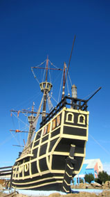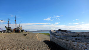 ような大型帆船が復元され展示されているのか、という疑問が呈されるのも全く無理からぬことであろう。 実は、サン・フリアンはマゼラン船隊の世界周航上におけるゆかりの地である。世界周航の途上(1520年)において、マゼラン船隊は このサン・フリアンの奥行きのある入り江に5隻の帆船を入湾させ、数ヶ月間越冬したことで知られる。奥行きが極めて深いことから、 冬期に南極方面からの吹きつける強烈な風とそれによる波やうねりをしのぐにはまたとない天然の避難場所であったであろう。 それに、船体を岸辺に引き揚げ、船底を「甲羅干し」して、貝殻などの付着物を掻き落とすには最適な場所になったに違いない。 ただ、サン・フリアンだけでなく、パタゴニア地域のいずれの地についても、当時にあっては食糧を十分に補給できるような 土地柄ではなかったに違いない。