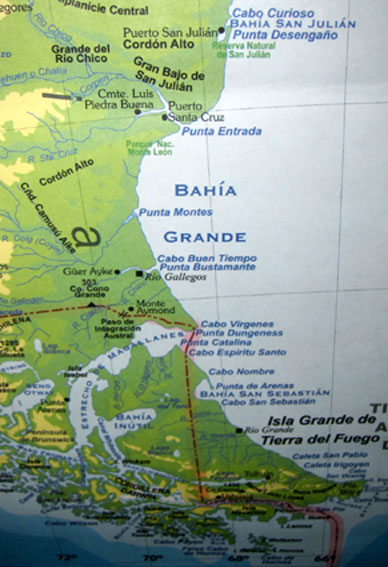 ![]() 画像右上の●印がプエルト・サン・フリアン。その少し下方にはプエルト・サンタ・クルス。 更に下方の■印はリオ・ガジェイゴスがある。そのすぐ下にマゼラン海峡が弓形状に伸びる。海峡の入り口の岬がビルヘン岬 (Cabo Virgenes)である。 [拡大画像: x26043.jpg] |