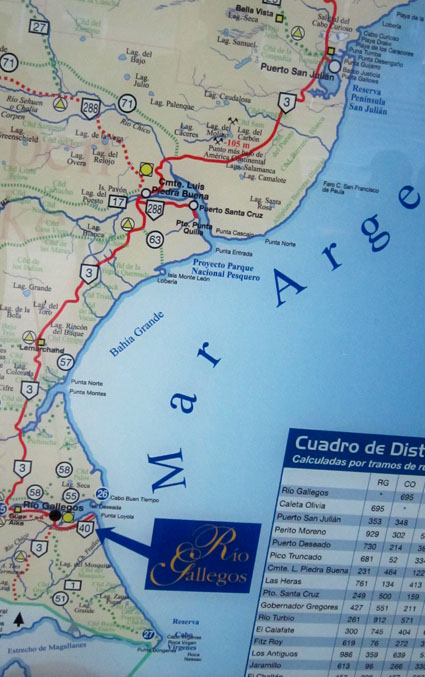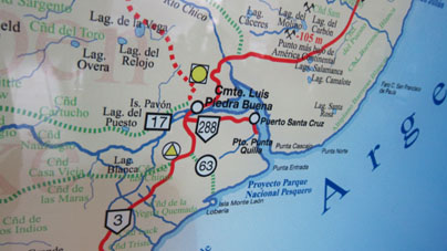 5![]() 5. 中央部の入り江内にプエルト・サンタ・クルス、その左奥にコマンダンテ・ルイス・ピエドラ・ブエナの町がある。そこから左方に 伸びるのがサンタ・クルス川である。地方道ルート63号線のマークのすぐ下方にモンテ・レオン島 (Isla Monte León) という地名が見える。 [拡大画像: x26052.jpg]
