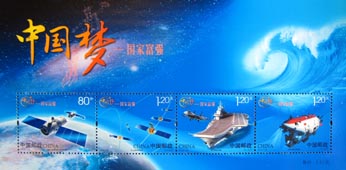 | 中国郵政は、2013年9月に「中国の夢、国家の富強」という、「宇宙と海洋」をテーマにした特別切手を発行した。 画像はそのワンセット4種からなる特別切手である。その内の一枚には、2012年に深度7,020mまで潜航することに成功した有人潜水艇 「蛟竜」(こうりゅう; Jiadong) が描かれている。 |