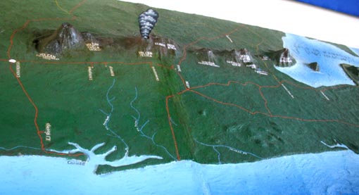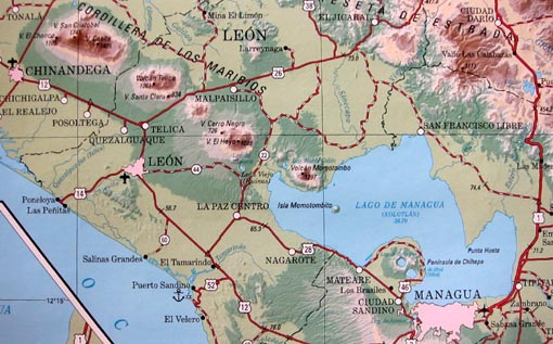 パナマ派とニカラグア派の勢力が拮抗するなかで、レセップスの遺志をついでパナマでの運河建設を実現しようと考えたフィリップ・ ビュノー・ヴァリーヤは、ニカラグアでは火山活動が活発で、しばしば地震が起きていることに着目。ニカラグアに運河を建設すれば、 将来的に地震によって運河の交通に支障が出るであろうということを、ニカラグア派への有力な反論としようと考えます。その背景には、 マルティニク島のプレ火山の噴火で4万人もの死者が生じた事件の記憶から、火山は危険だと考える人々が多かったという事情がありました。 このため、ヴァリーヤは、ニカラグアに活火山があることの動かぬ証拠として、ニカラグアの切手に注目します。切手には、噴煙を上げる モモトンボ火山の風景が誇らしげに描かれていたからです。かくして、ヴァリーヤは、運河建設地を決める米議会の議員90人に資料として 提出するため、モモトンボ火山の切手を90枚調達すべく奔走します。 ヴァリーヤが切手の調達を始めた時、すでに、議会の開会までは残り48時間となっていました。しかし、ワシントンでは7枚しか切手を 入手できなかったため、彼はニューヨークへと走り、ともかくも90枚を確保します。時間内に枚数を確保することが最優先でしたから、 文字通り、札束でかき集める手法がとられ、最後の5枚に関して、ヴァリーヤが支払った金額は、この切手の相場から考えると、 異常な高値だったそうです。 審議当日、議員たちの机の上には、台紙にマウントされた切手が配られます。そして、その下には「ニカラグアの火山が現在活動中で あることの公的な記録」との文言が付け加えられていました。 かくして、投票の結果、わずか4票差でパナマ案が採択され、パナマ運河建設が実現に向かって動き出すことになりました。 後に何人かの議員が告白したところによると、最後の最後で、彼らの態度を決めたのは、ニカラグアの切手だったとのことです。⌋ [2014.8.5 初記][拡大画像: x26033.jpg] 1 ![]() 1. 首都マナグア (右最下) はマナグア湖(Xolotolán, Lago de Managua)に面する。同湖に米粒大のモモトンビート島 (Isla Momotombito) が浮かび、そのすぐ左上に富士山のような円錐形のモモトンボ火山がそびえる。ニカラグア太平洋岸に沿って数多くの火山が連なる。 左最上端のサン・クリストバル火山から、テリカ火山、セロ・ネグロ火山、エル・エヨ火山、モモトンボ火山へと続く。 [拡大画像: x26122.jpg]