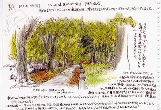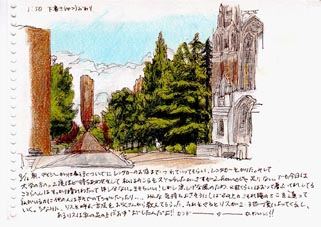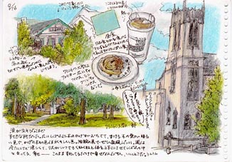 いずれもシアトルのシンボル的存在である。 パイク・マーケットの正式名称は「パイク・プレイス・マーケット」(Pike Place Market) で、現在全米で最も長い歴史をもつ市場となっている。ダウンタウンの First Avenue と Pike Street との交差点に辺りに パイク・マーケットのうちの「フィッシュ・マーケット(Pike Place Fish Market)」への入り口がある。その入り口の屋根には 「パブリック・マーケット・センター(Public Market Center)」という大きな看板が掲げられている。画像はその看板のある入り口 付近をスケッチしたものである。 フィッシュ・マーケットではキングサーモン、ロブスター、カニ類はもちろん、その他多種多様の新鮮な魚貝類が店頭に並べられる。 そして、場内の売り子には、いつもほほ笑みと明るさ、活気が満ち溢れている。時には威勢のよい掛け声が響き渡る。 魚市場だけでなく、色とりどりの新鮮な野菜、果物、切り花などを扱うセクションもある。 地階にはアンティーク、レコード、アクセサリーなどのストアが並ぶ。 因みに、スターバックスの第1号店(1971年開店)もあるが、座る場所はなく、ドリンクを買うだけという。 シアトル水族館(Seattle Aquarium)がマーケット から4~500m離れたところにあるが、その周辺地区はかつて櫛の歯型の埠頭が並んでいたところで、今では再開発され大勢の観光客や 市民が憩うウォーターフロントとなっている。 [1996年9月18日 シアトル、パイク・プレイス・フィッシュ・マーケット入り口前にて/Sketched by Nagisa Nakauchi (中内渚)][拡大画像: x26134.jpg] |