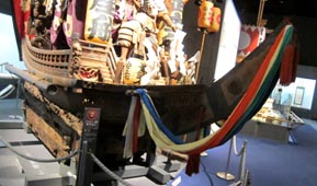 江戸時代 本館蔵 旧安立七丁目町会寄贈 大坂の町やその周辺の村々では、近世から夏祭りなどの祭礼に「だんじり」(地車・車楽などと表記)とよばれる山車 (だし)が曳行されてきた。この御座船地車は、昭和30年(1955)頃まで旧安立 (あんりゅう) 七丁目町会(現住之江区) が、止止呂支比売命(とどろきひめのみこと)神社(若松神社)の秋祭りに出していたもので、寛政年間(1789~ 1801)に地車大工と船大工が制作したと伝えられる。船型の地車は市内でも類例が少ないが、安立町は住吉大社の氏子地域でもあり、 海神住吉大神に因んだ形態と考えられる。」 [2012.10.8. 大阪歴史博物館にて][拡大画像: x26206.jpg] |