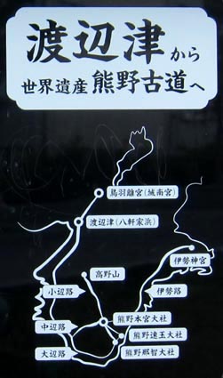 平安時代後期(12世紀頃)から熊野参詣が盛んになった。白河上皇や鳥羽上皇は鳥羽離宮(現在の 京都市城南宮あたり)で身を清め道中の無事を祈願した後、京を出立。淀川を舟で下って渡辺津(現在の天神橋あたり) で上陸し、熊野街道を通って熊野三山(和歌山県)へ、往復1ヶ月ほどかけて参詣した。 熊野本宮・新宮・那智のいわゆる熊野三山への路は図のように、メインルートの中辺路のほか、大辺路・小辺路・伊勢路があり、 峠越えの古道を中心に、2004年に世界遺産に登録されている。江戸時代以降このあたりは八軒家浜と呼ばれている。 協力:城南宮、熊野三山協議会、大阪歴史博物館」 ![]()