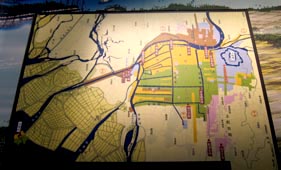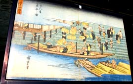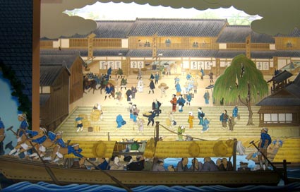 三十石船は八軒家と京・伏見の間、十一里余(約四五㎞)を上り一日、下り半日で運航し、江戸時代を通して 貨客輸送の中心を占めた。明治三年(1870年)に蒸気汽船が就航すると三十石船は衰退し、明治四三年(1910年) に京阪電気鉄道が天満橋―京都五条間に開通して、八軒家は淀川の貨客輸送のターミナルの役目を終えた。 しかし、現在、水の都大阪再生の核となる取り組みとして、水上交通の拠点となる船着場が八軒家に 完成し、往時の賑やかな水上ターミナルの役目は、現代にも引き継がれている。」 ![]() 3. 近世における大坂概図。右上の六角形印が大坂城、その左上で大川が大きく曲がっている辺りが八軒家浜である(拡大図参照)。 [拡大画像: x26176.jpg][拡大画像: x26228.jpg][拡大画像: z20105.jpg] 4 ![]() 4. 八軒家着船場における庶民・乗降客等の賑やかな発着場風景を描いた展示。パネルには、「八軒家は中世以来、 京都~大坂を結ぶ淀川交通の起点で、旅人や運送に携わる人々で賑わった。八軒家を発った三十石船 (さんじゅっこくぶね) は、 淀川をさかのぼり枚方 (ひらかた) を経て伏見に至った。上りに一日、下りに半日を要した。野崎参 (のざきまいり)・ 金毘羅参 (こんぴらまいり) の船なども発着した。」 [拡大画像: x26229.jpg] * 画像3・4: 大阪歴史博物館 |